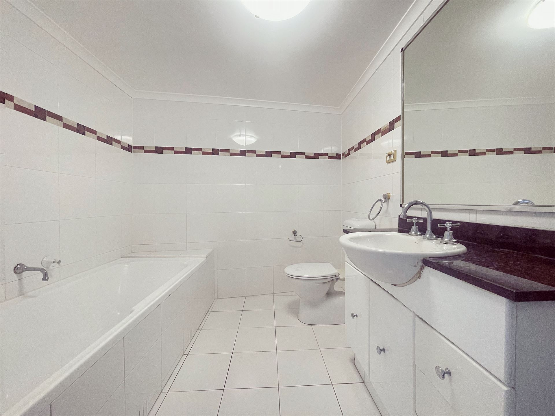 - Bathroom: Features a full-sized bathtub, separate shower, sleek vanity with storage, and a classic tiled finish.